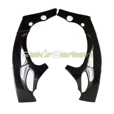 Las cubiertas de fibra de carbono están fabricadas con tejido de carbono plain weave de 160 g/m² con un sistema de resina epoxi de calidad, reforzadas con tejido híbrido carbono/kevlar plain weave de 170 g/m².