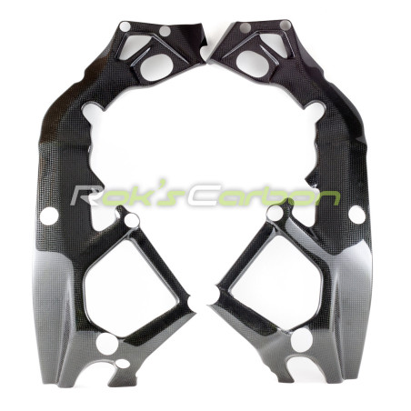 Les protections en fibre de carbone sont fabriquées en tissu carbone tissé toile 160 g/m² avec un système de résine époxy de qualité, renforcées par un tissu hybride carbone/kevlar tissé toile 170 g/m².