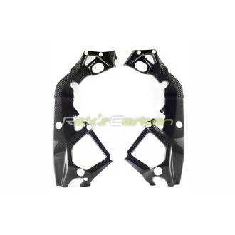 Les pièces en fibre de carbone sont fabriquées en tissu carbone tissé toile 160 g/m² avec un système de résine époxy de qualité, renforcées aux zones de fixation avec du tissu carbone.