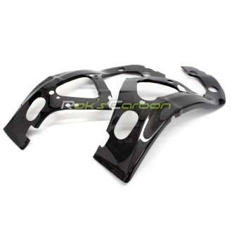 Les pièces en fibre de carbone sont fabriquées en tissu carbone tissé toile 160 g/m² avec un système de résine époxy de qualité, renforcées aux zones de fixation avec du tissu carbone.